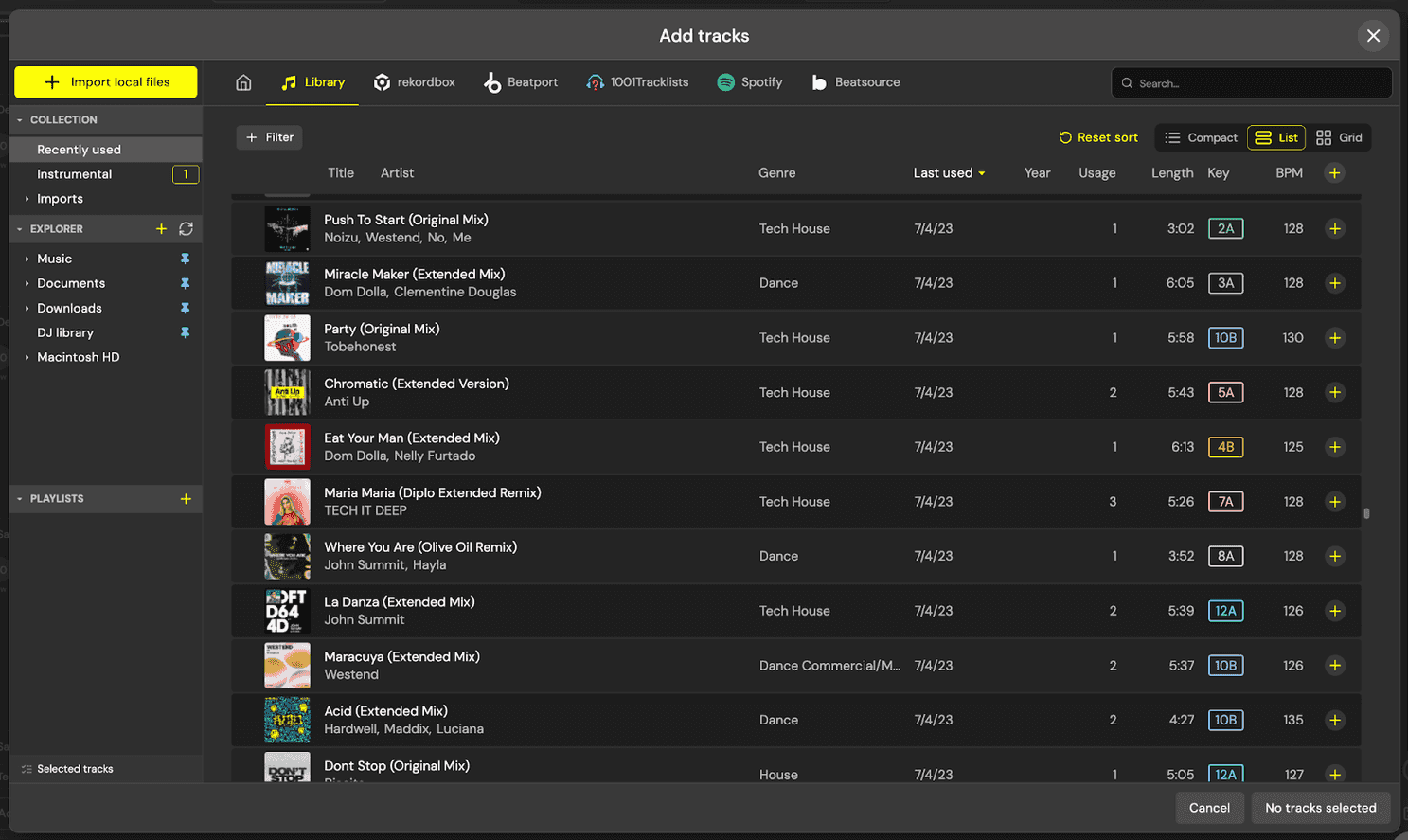 You can add tracks with the yellow Import local files button or browse music from 3rd party software libraries like rekordbox etc.