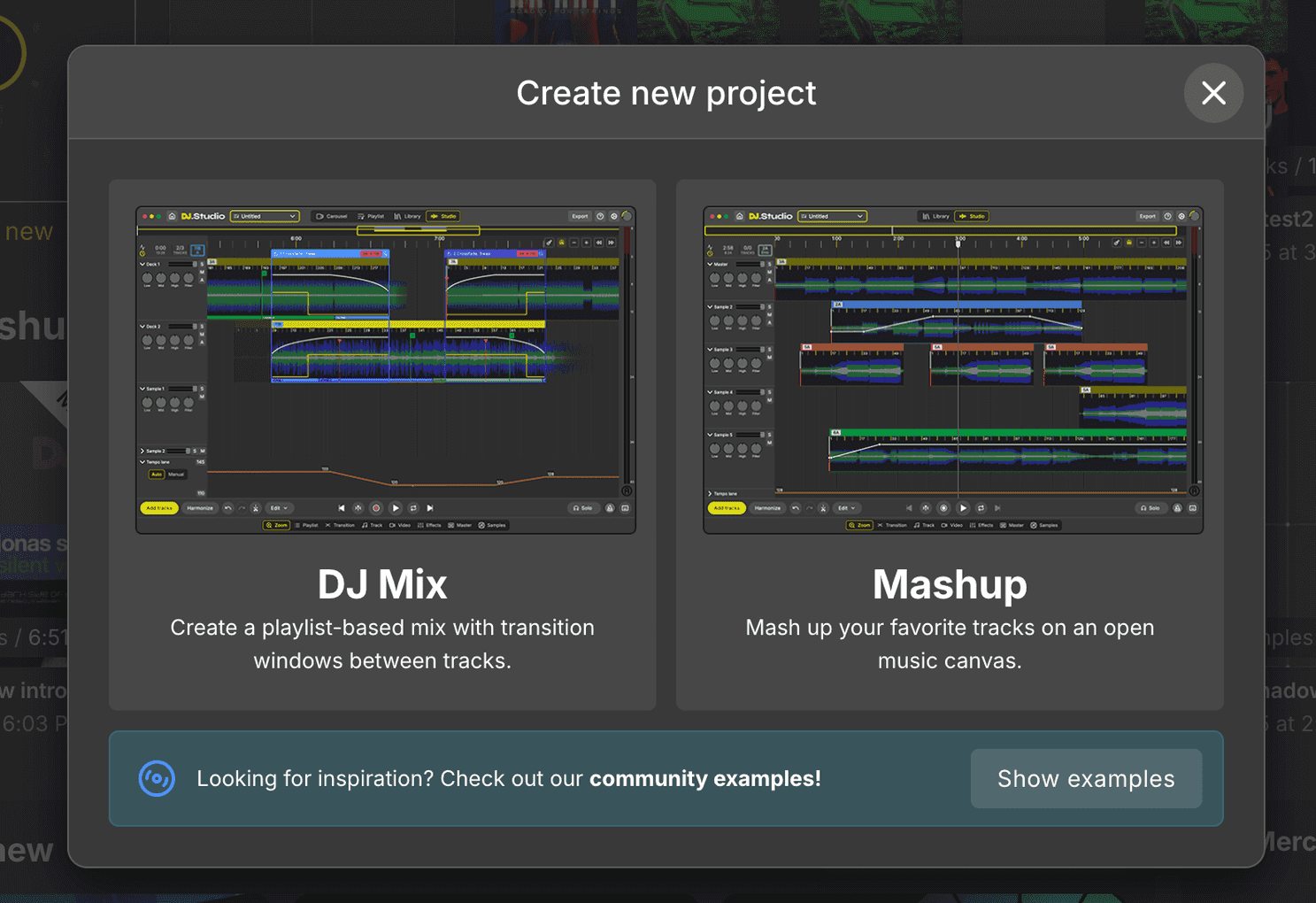 - Choose Mashup if you wat to combine tracks to a mashup on a free canvas.