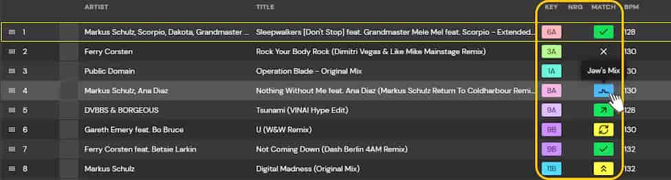 DJ.Studio makes harmonic mixing super easy and does all the calculations for you to make harmonic blends without any effort. it shows you the key of all your tracks and lets you know how well they match to others, It can also suggest and automatically arrange your tracks in a harmonically matched order.