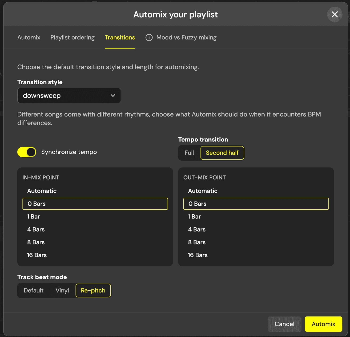 Key vs. BPM Priority: You can tell Automix whether to prioritize harmonic compatibility (mixing in key) or a smooth progression of beats per minute.