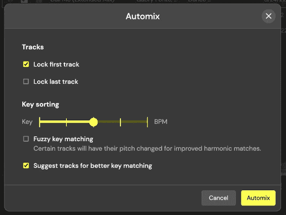 5. Customize Your Automix Settings - This is where you can tailor the Automix to your specific needs. You’ll see a slider that lets you choose the priority between ‘Key’ and ‘BPM’. If you want a mix that flows perfectly in key, slide it towards ‘Key’. If a gradual increase in tempo is more important, slide it towards ‘BPM’. You can also choose a balance between the two. You also have the option to lock the first and last tracks in your playlist if you have a specific intro and outro in mind.
