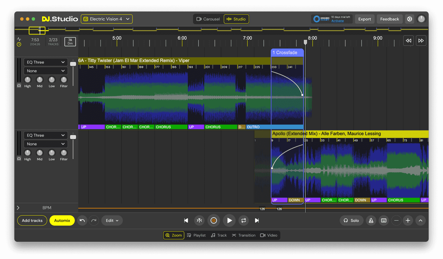 One noticeable advantage is the level of creativity you can express in DJ.Studio's timeline editor. Particularly in transitions, for example, there's only so much you can do when mixing in real time with two hands on a DJ controller. You can only twist two knobs at the same time - however, with DJ.Studio you can edit all the parameters simultaneously in the timeline, including EQ volume filters effects. This makes it easier to achieve very high-quality transitions with minimal effort - improving the final sound quality of your mix.