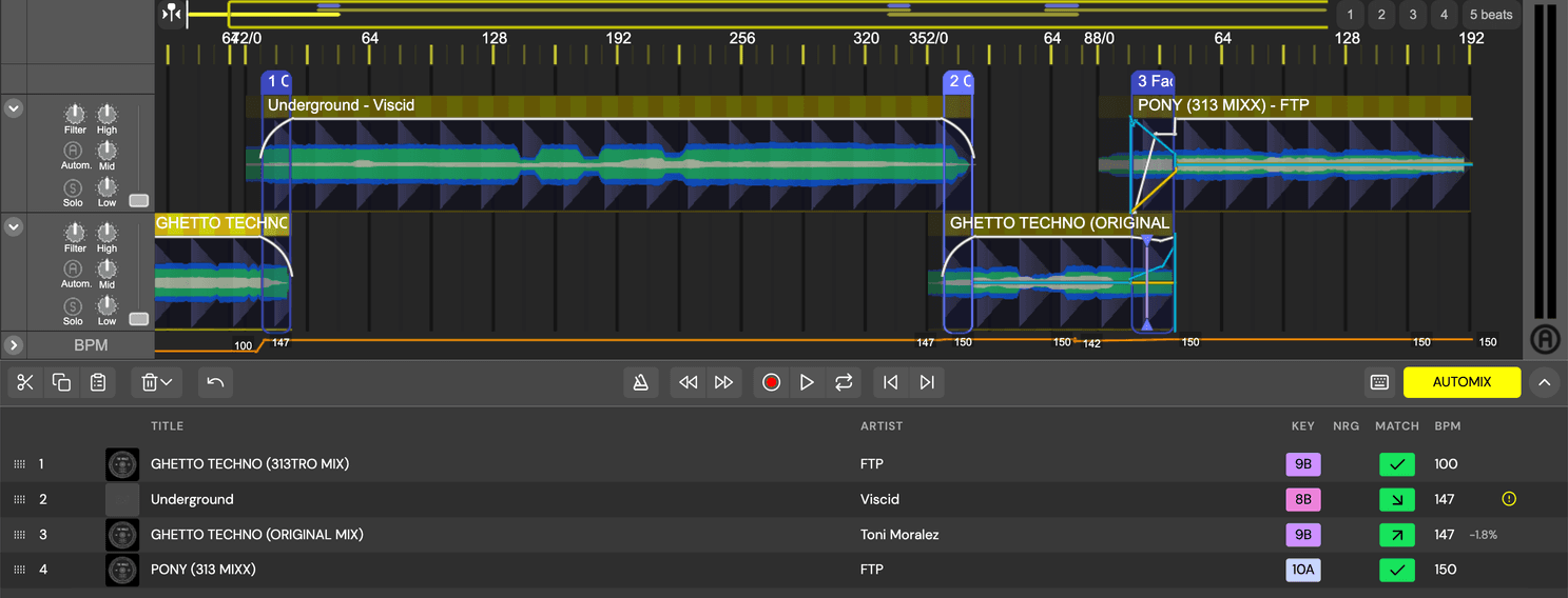 Automix - The automix tool automatically arranges your mix and applies transition presets, instantly creating seamless transitions and a nearly finished mix. By using key and tempo analysis, DJ.Studio can work out the best order of your tracks based on harmonic mixing and beat-matching.