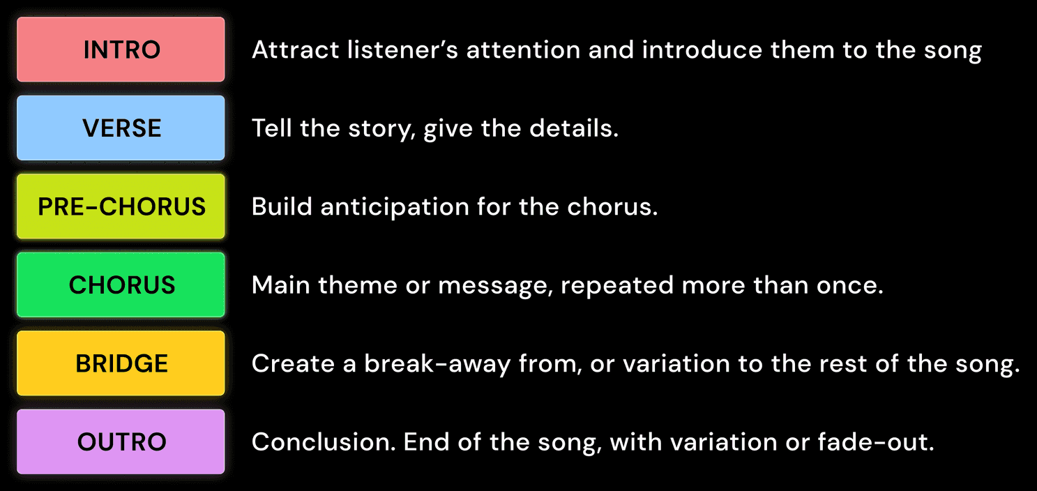 Bridge - A bridge, often found in traditional songwriting, is a third section of the track that differs from both the verse and the chorus. It’s typically only played once, offering a refreshing change before the song returns to more familiar territory.